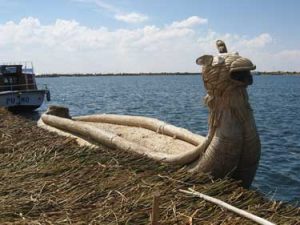 The totara is a cattail type of rush that grows in the shallows of the lake. The floating islands are entirely comprised of totara. It grows densely enough to cut blocks which they tie together to form the very “ground” they walk on. The islands are anchored by rope tied to stakes driven into the lake bottom. Totara provides the Uros with building materials, food, medicine, and fuel. They build their houses and boats with it. The asparagus-like heart of the reed is an ingredient in most meals. This white inner part of the plant contains iodine, which prevents goiter. They also wrap the reed around an injury to help alleviate pain. The flower is brewed to make a tea. They make a platform of stones on the “ground” and use dried reeds to cook meals on the stones. Totara reed is traded for essentials such a quinoa, which is a nutritious grain. In recent years, they have used reed to fashion craft items for the tourist trade.