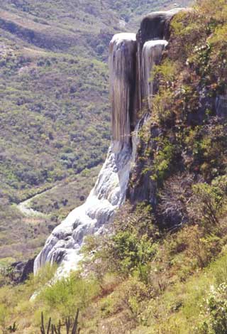 Una de las “cataratas” más inusuales del mundo se encuentra en el Valle de Mitla, a unos 80 kilómetros de Ciudad Oaxaca. Al filtrarse a través del carbonato de calcio, magnesio y azufre, el agua crea burbujas que la hacen parecer hirviente. De ahí su nombre, “Hierve el Agua”. Pero el agua es sólo tibia, y después de llevar sus minerales sobre un acantilado durante miles de años, ha surgido una catarata petrificada. Los agricultores han encauzado las aguas para regar sus sembrados desde hace unos 2,400 años. Hierve el Agua es la única fuente de agua en esta tierra accidentada y semiárida. Hoy en día los visitantes chapotean en las piscinas artificiales del acantilado o hacen caminatas hasta el fondo para asombrarse ante las columnas irregulares y estriadas que se yerguen más de 90 metros.