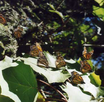 The uncountable millions of Monarchs that the visitor sees in the sanctuary are a group called the “Methuselah” generation. They emerge from their cocoons as far north as southern Canada, and spend the summer fattening up on the milkweed (algodoncillo) plant. They do not develop sexually, instead putting all of their life force into the nearly 3,000 mile flight they must make in the fall. They leave in August and September, averaging 45 to 80 miles a day, and arrive in Mexico in November, never having flown the route before. Using a combination of instinct and the ability to navigate by sun, they often arrive back at the very same trees from which their ancestors departed. Here, they will hibernate for the winter months.