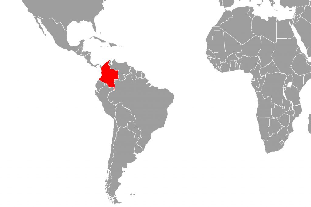 Colombia is located near the top of South America, where Central America connects to the continent.