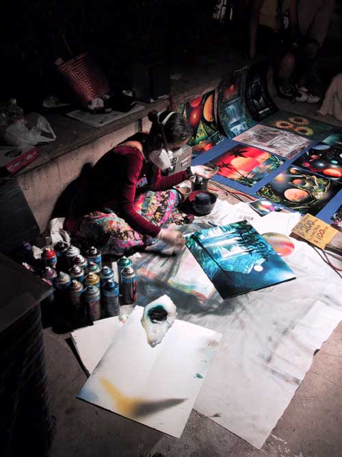 A beautiful woman wearing a velvet blouse with an embroidered neckline and a long colorful skirt sits cross-legged on the ground. She has a respirator strapped to her face as she leans over her poster board canvas, spraying a fine mist of cheap, off the shelf paint onto her work-in-progress. Not a speck of paint mars her clothes. She is halfway through this spray paint masterpiece that will take her perhaps another 10 minutes to complete. She has already produced at least a dozen today.
