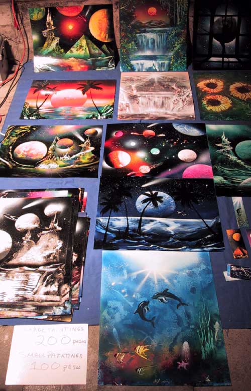 The crowd murmurs excitedly as an ethereal scene emerges of a massive moon rising into a starry sky over a craggy snow-clad peak. Next to the artist are finished works that offer fantastic scenes of enormous planets orbiting pyramids or weather carved peaks with stairways spiraling to the top. Gigantic moons loom over oceans or waterfalls framed in palm trees. Dolphins cavort in a weightless underwater world lit by an ultra-bright sun. The paintings have tremendous appeal and are quite inexpensive. The wonder of it is that the artist uses only spray paint, various sized plates to define the orbs, fingers and crumpled newspaper to smear and texture, and a blowtorch to effectuate rapid drying. It is performance art that produces a finished product.