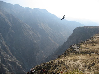 To make life even harder, condors have been persecuted by humankind for hundreds of years. Indigenous people have long hunted them because they believe the bone and organs have medicinal powers. Farmers kill them because the erroneously believe that condors kill their livestock. Deforestation and pollution have also decimated their numbers. Though they were added to the endangered species list in 1973, their numbers may still be declining in some parts of South America. Any comeback will be slow because these birds, which can live for 50 years, mate for life, and if the mate is killed, the survivor may not find another mate. Also, condors mate only every few years, and their chicks take 6-7 years to reach sexual maturity. Thus, replenishing their numbers is a slow process. One bright spot is that methods similar to those used to reintroduce the California condor into the wild are being tried in South America with some success. Also, many people are starting to realize that tourists come to see the condors, and if nothing else they have an economic incentive to protect them But this silent bird, which has no voice box, has been revered in South America since at least 2500 B.C. Intertwined with Andean mythology, the condor symbolizes power and health to the indigenous people of the highlands. It was worshiped as a ruler of the upper world, and was related to the sun god of their belief system. I do not believe the Andean people will let this magnificent bird disappear, for they are awakening to the truth that the condor is part of the fabric of their own story. If they let it disappear part of their own soul would die with it. As we watched the condors soar above us, we felt we needed them to remind us to lift ourselves to greater heights so that our spirits may travel further on this earth. Without them, we would be less human and the world would be a lonelier place.