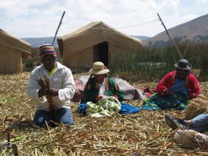 The totara is a cattail type of rush that grows in the shallows of the lake. The floating islands are entirely comprised of totara. It grows densely enough to cut blocks which they tie together to form the very “ground” they walk on. The islands are anchored by rope tied to stakes driven into the lake bottom. Totara provides the Uros with building materials, food, medicine, and fuel. They build their houses and boats with it. The asparagus-like heart of the reed is an ingredient in most meals. This white inner part of the plant contains iodine, which prevents goiter. They also wrap the reed around an injury to help alleviate pain. The flower is brewed to make a tea. They make a platform of stones on the “ground” and use dried reeds to cook meals on the stones. Totara reed is traded for essentials such a quinoa, which is a nutritious grain. In recent years, they have used reed to fashion craft items for the tourist trade.